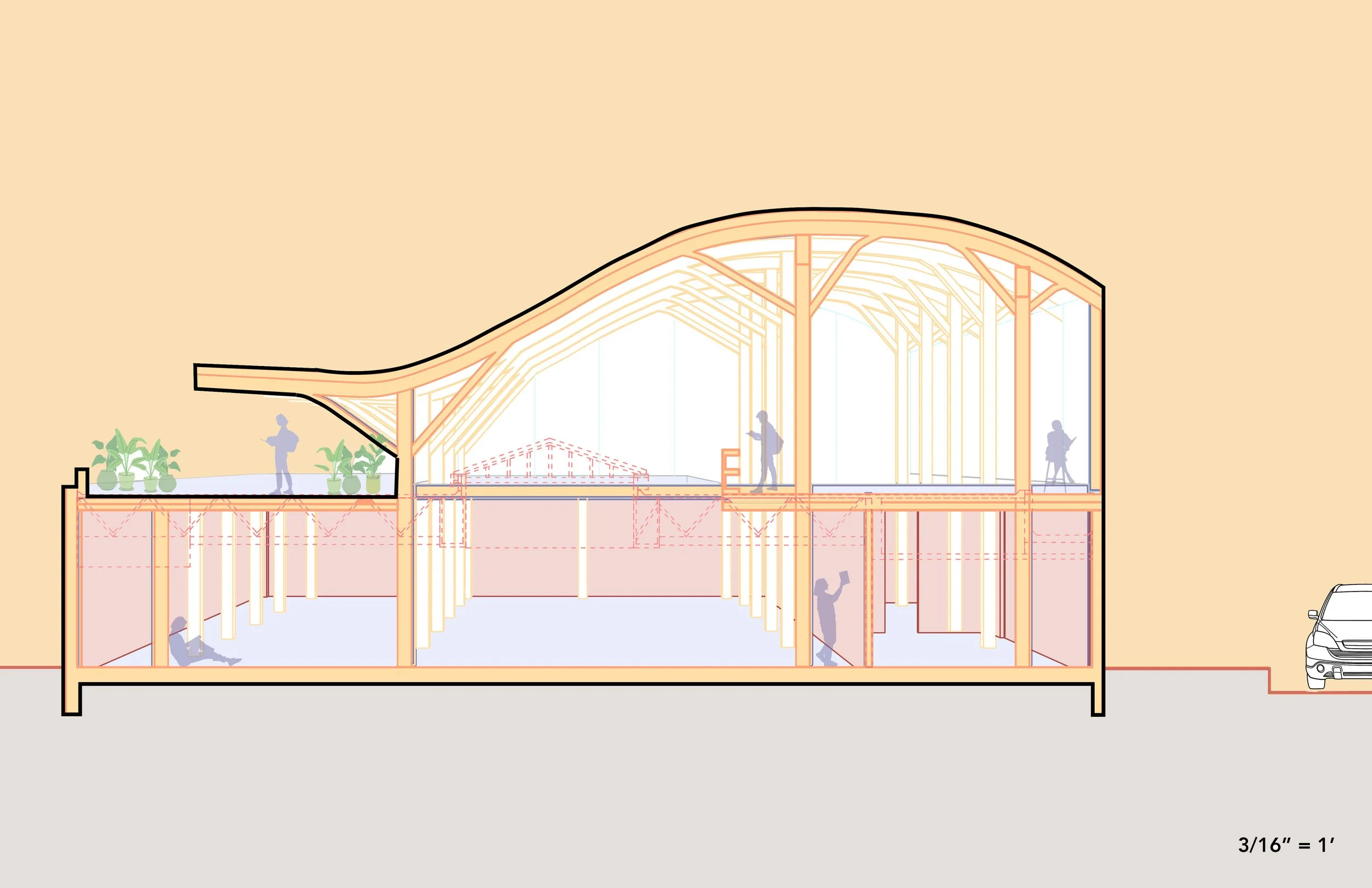 The Spring Creek Branch of the Brooklyn Public Library in East New York is one of the many ‘Lindsay Box’ libraries built in the 1970s—simple, cost-effective buildings with limited design. Many lifelong residents had no idea this branch existed. To better serve the neighborhood, we vertically expand with precision-milled Mass Timber elements, making it more visible, inviting, and engaging. With East New York’s significant population of young people under 25 without a high school diploma, this branch offers improved educational programing, with an emphasis on school retention and nature exploration.